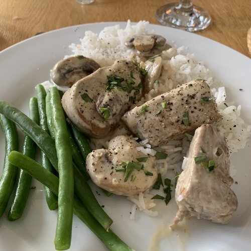 Sliced pork loin and mushrooms in creamy tarragon and white wine sauce.